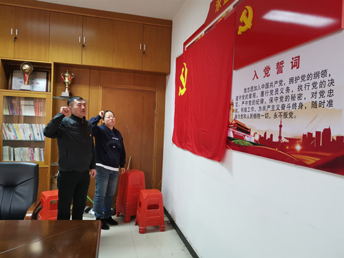 “我志愿加入中國共產黨,擁護黨的綱領,遵守黨的章程,履行黨員義務,執行黨的決定,嚴守黨的紀律........。”在莊嚴的新黨員入黨宣誓儀式上,面對鮮紅的黨旗,預備黨員們在領誓人的帶領下,面向鮮紅的黨旗,舉起右拳許下錚錚誓言,表達了自己對黨的忠誠和為共產主義奮斗終身的決心。